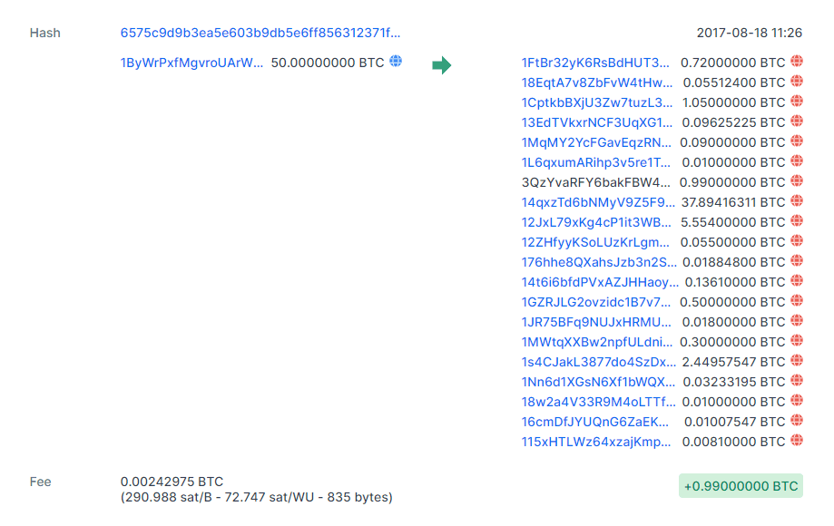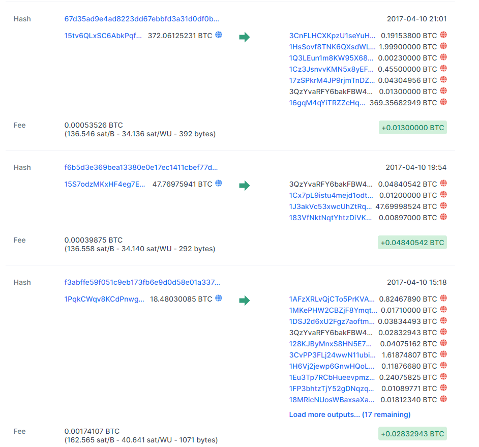 Внизу под балансом пошел огромный список транзакций по кошельку. Все операции, разумеется, захэшированны, то есть не видно, ни отправителей при входе, ни получателей при выходе. То есть по сути, та же банковская выписка — средства получены, средства выведены, только не виден источник и адресат. Однако были видны суммы и даты переводов. Во мне проснулся аудитор, и я решил в них покапаться. Почему этого не сделали люди с канала PolitRussia, я в душе не знаю. Видимо, гораздо важнее в одном предложении сказать фразу «мамкины революционеры» три раза, чем поизучать информацию. Сразу про тезисы в видео. Они почти все ошибочны, и призваны просто разжечь. Во-первых, курс битка постоянно менялся, и те калькуляции, которые они там привели типа одно поделить на другое, в корне не верны. Так вот. Я стал листать и смотреть. Причем стал смотреть старые операции, за 17 год. По большей части там были небольшие (относительно небольшие) переводы ~0.01 BTC. По тому курсу около 20 баксов. Это скорее всего обычные донаты. Были и покрупнее 0,1 BTC и около того. Но я увидел пару операций, который очень сильно привлекли мой взгляд. На дате 10.04.17 на кошелек были операции на больше 400 битков.